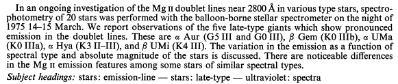 | Giant Stars, Late Stars, Magnesium, Stellar Spectra, Ultraviolet Spectra, Atomic Energy Levels, Balloon-Borne Instruments, Emission Spectra, Fine Structure, Spectral Line Width, Stellar Spectrophotometry |